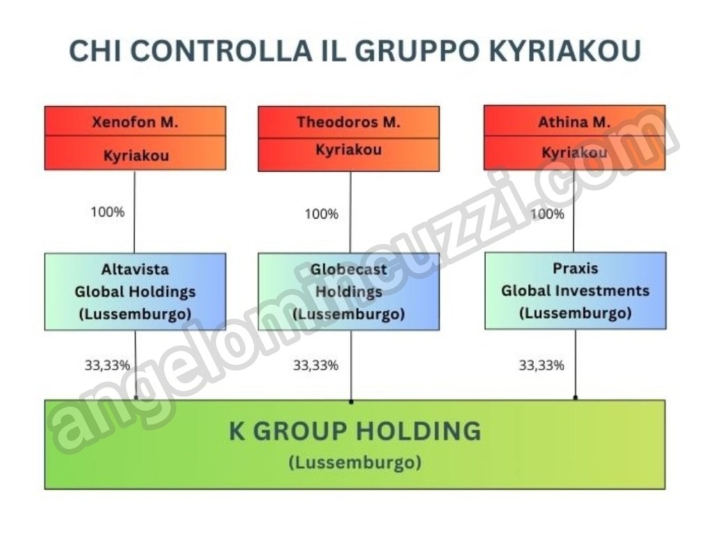 Xenofon controlla la sua partecipazione attraverso la società lussemburghese Altavista Global Holdings. Theodoros tramite la Globecast Holdings e Athina attraverso la Praxis Global Investments. Le tre società sono state tutte costituite lo stesso giorno, il 20 ottobre 2014, davanti al medesimo notaio lussemburghese. Poi, nel marzo 2015, ognuna di loro ha assorbito una società gemella irlandese che portava l’identico nome dell’entità lussemburghese. Probabilmente le partecipazioni nel K Group erano detenute dalle holding domiciliate in Irlanda.